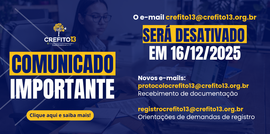 🚨 ATENÇÃO, PROFISSIONAIS! MUDANÇA NOS E-MAILS DO CREFITO-13 O CREFITO-13 informa que alguns endereços de e-mails institucionais serão DESATIVADOS e substituídos nas próximas semanas. Fique [...]